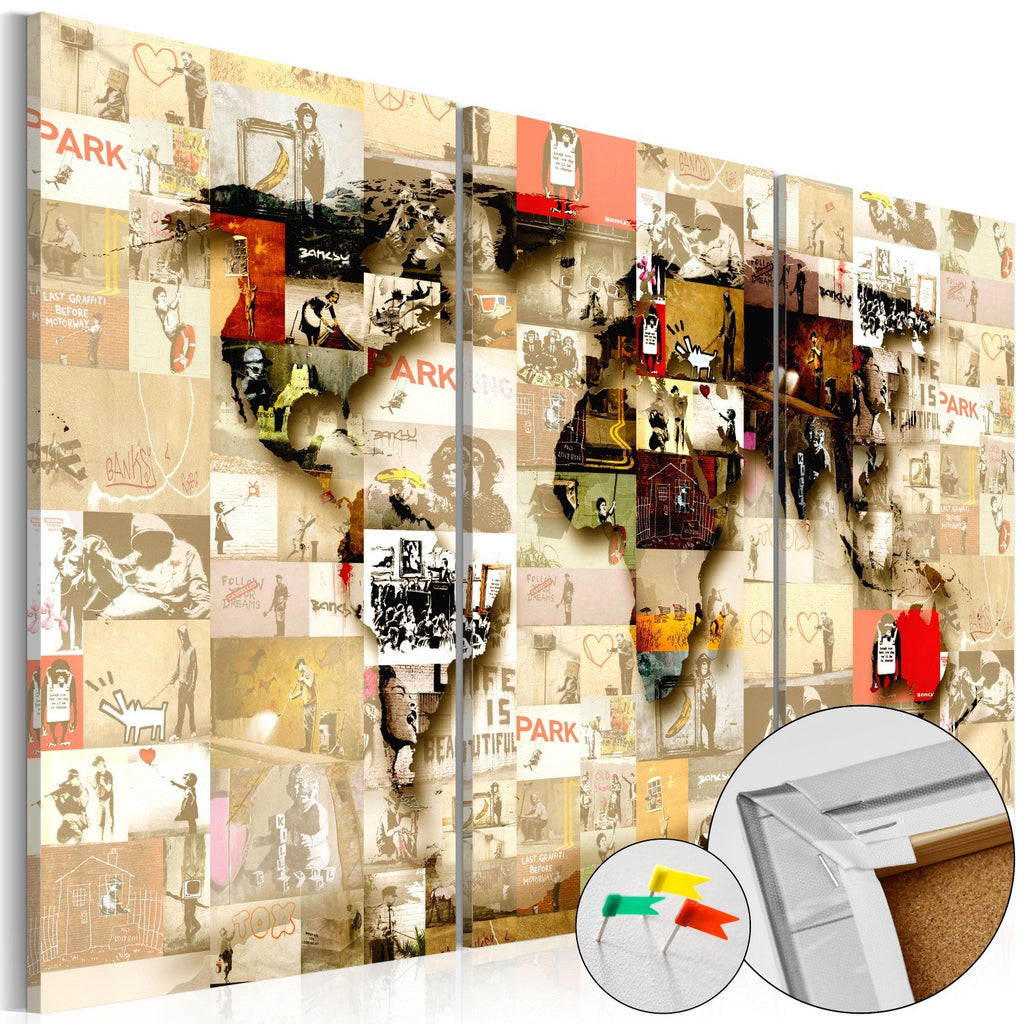 Decorative pinboard "Graffiti World [Cork Map]" is a product for people searching for original wall decorations. Thanks to ecological material and interesting design, the ordinary cork board changes into a stylish decoration, which you could use in different ways. You can pin your notes and photos and mark the visited places on the map. Decorative pinboard "Graffiti World [Cork Map]" is much lighter from the traditional wall decorations. Thanks to that the decorative cork boards can be hung anywhere in your apartment or office. The canvas print is applied on the cork board. Print is characterized by bold colors and reflects even the finest details. Stick in and pin your notes and create your own individual design on your wall!