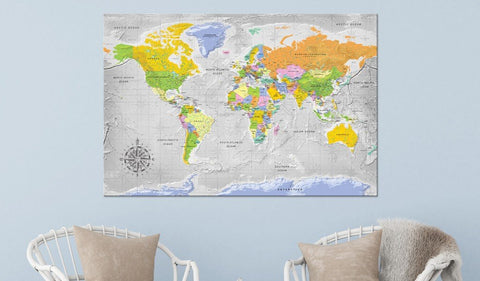 Decorative pinboard "World Map: Wind Rose [Cork Map]" is a product for people searching for original wall decorations. Thanks to ecological material and interesting design, the ordinary cork board changes into a stylish decoration, which you could use in different ways. You can pin your notes and photos and mark the visited places on the map. Decorative pinboard "World Map: Wind Rose [Cork Map]" is much lighter from the traditional wall decorations. Thanks to that the decorative cork boards can be hung anywhere in your apartment or office. The canvas print is applied on the cork board. Print is characterized by bold colors and reflects even the finest details. Stick in and pin your notes and create your own individual design on your wall!