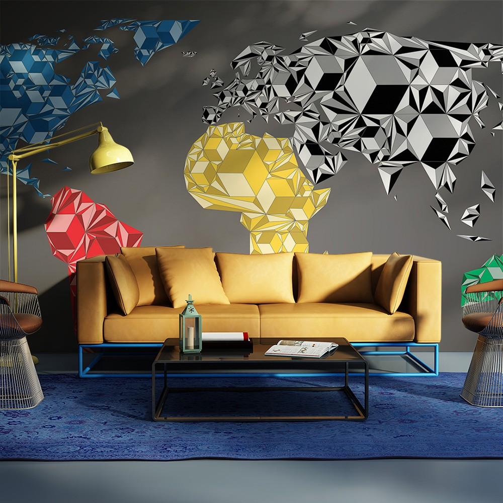 Resistant, water-rejecting and scratch-proof fleece wallpaper "Map of the World - colorful solids". Wallpaper "Map of the World - colorful solids" with the inspiring motive will be an effective eye-catch for each interior. Fleece wallpapers are attached to the wall with special glue. They can be installed in each room even in the bath or in the kitchen. Fleece wallpaper, halfmatte coating. 100% fleece - covers small unevenness of the wall. It creates a thermal insulation layer and allows the walls to breathe. Water resistant printing is very durable.